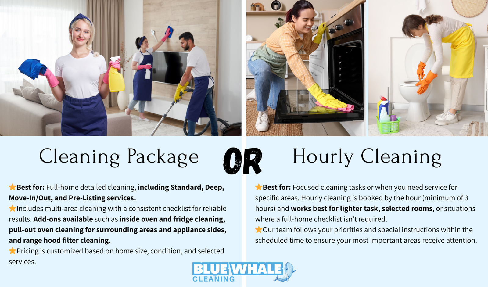 At Blue Whale Butler, we offer two flexible cleaning options designed to meet different household needs: Cleaning Packages and Hourly Cleaning.